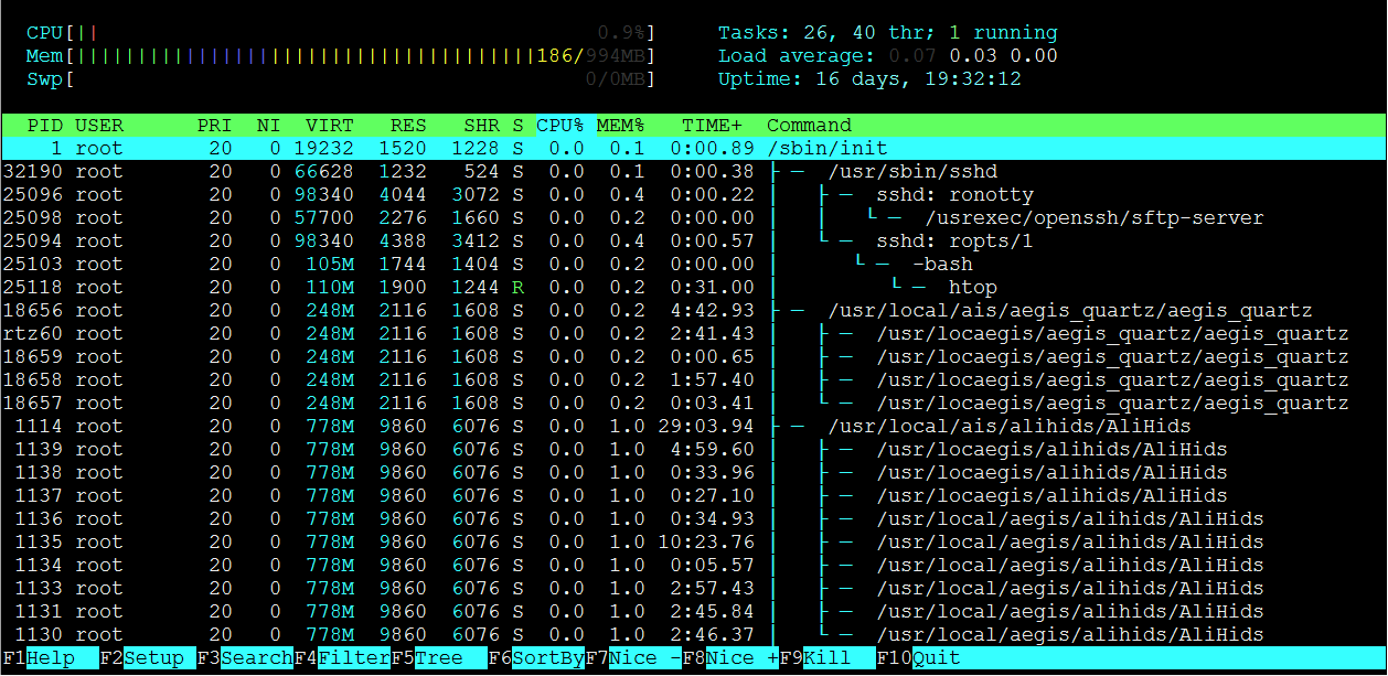返回结果左侧显示 CPU、内存、交换区 swap 的使用情况,右侧显示任务、负载、开机时间,下面的主体部分就是进程实时状况,底端是 F1-F10 功能键。