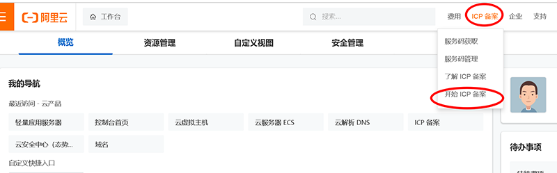 拿着您得到的服务号,进入阿里云官网(www.aliyun.com)右上角点击“ICP备案--->开始ICP备案”