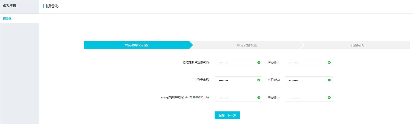 2、在初始化页面的密码初始化设置区域,请您依次设置主机管理控制台登录密码、FTP登录密码及数据库密码,单击保存,下一步。