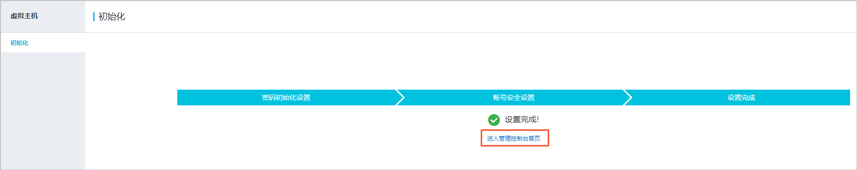 5、在设置完成页面,单击进入管理控制台首页。