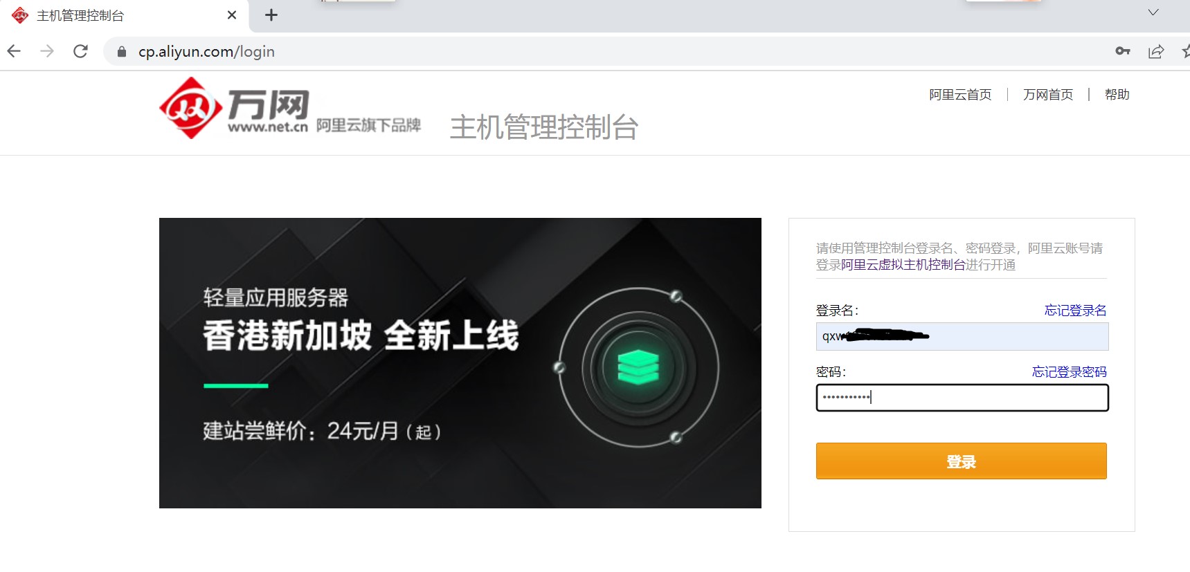 1、登录阿里云虚拟主机管理页面(登录地址https://cp.aliyun.com,第一次登录需要主机名及密码,如您不知道此信息请联系购买方索取)。