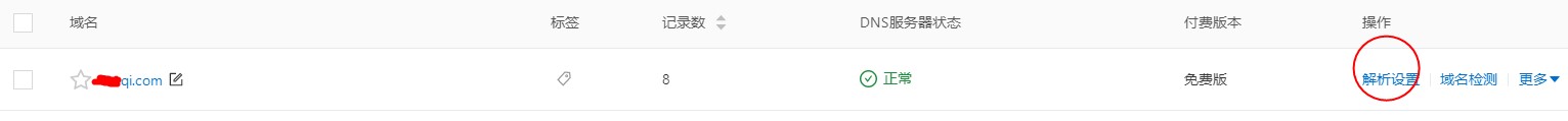 2、在域名管理平台里找到您的域名,如下 ,进入域名管理平台进行域名指向,指向到您购买的主机IP上(这个IP在购买的主机管理平台-域名绑定 可以找到,如上图),同样的,也和主机绑定一样,做两条解析记录