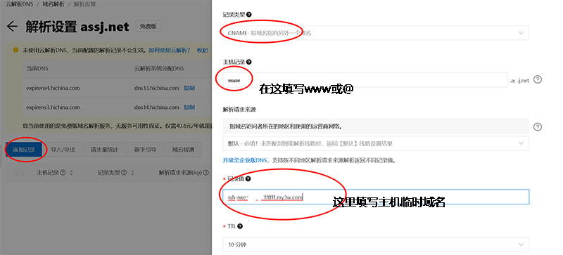 第一种cname指向操作如下,同样的,此图为www,建议各位在具体做指向上也加一个@(就是将图中的www用@代替
