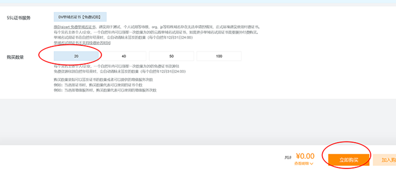 例如:当选择证书时,购买数量代表可以使用的证书个数