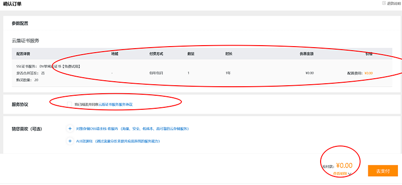 2、然后下单付款(免费证书也要有一个购买动作)结算,购买成功