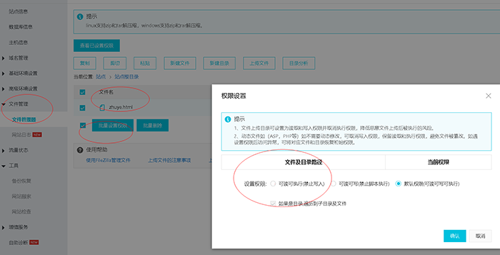 第7,主机管理平台-文件管理器-将首页文件及重要文件权限改为可读可执行(禁止写入)重要!其他目录建议设置权限/apps禁止写入/config读写权限/core禁止写入/data读写权限/doc禁止写入,可删除/rewrite禁止写入,可删除/runtime读写权限/static读写权限/template禁止写入。总之网站文件权限最高设置755,切勿777。
